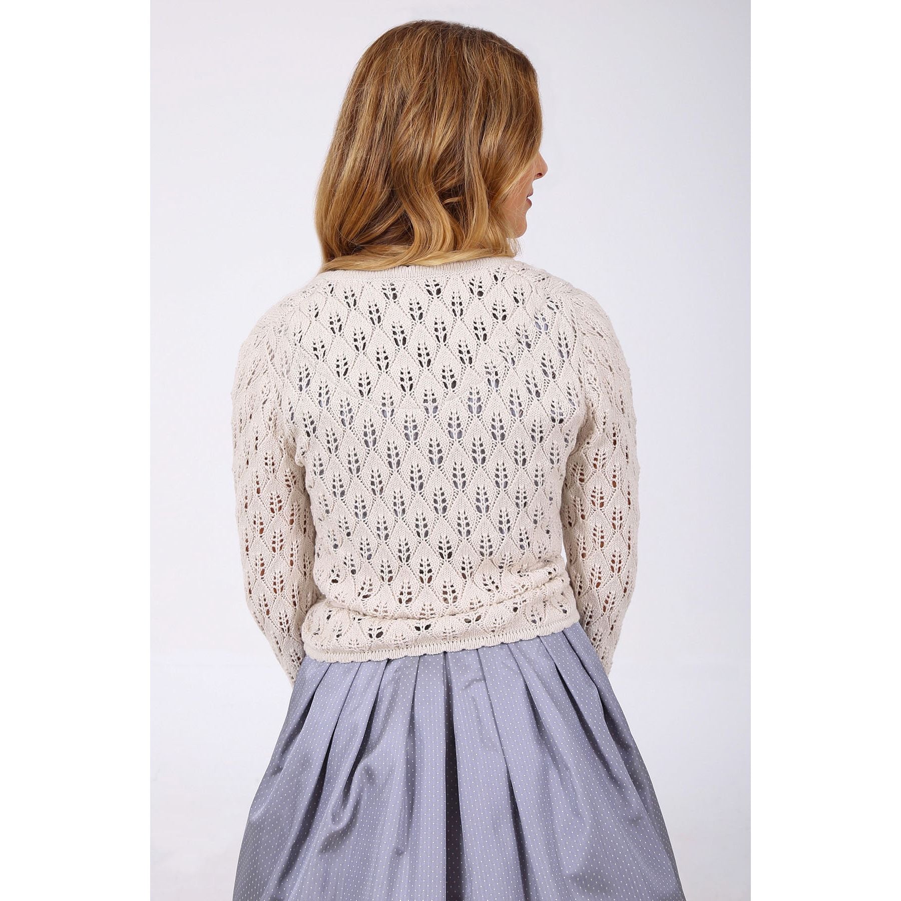 Liebliche Strickjacke von Krüger Madl in beige. Die Jacke Florentine passt perfekt zum Dirndl oder zur Lederhose. Auch im Alltag ist die leichte Strickjacke sehr vielseitig zu kombinieren