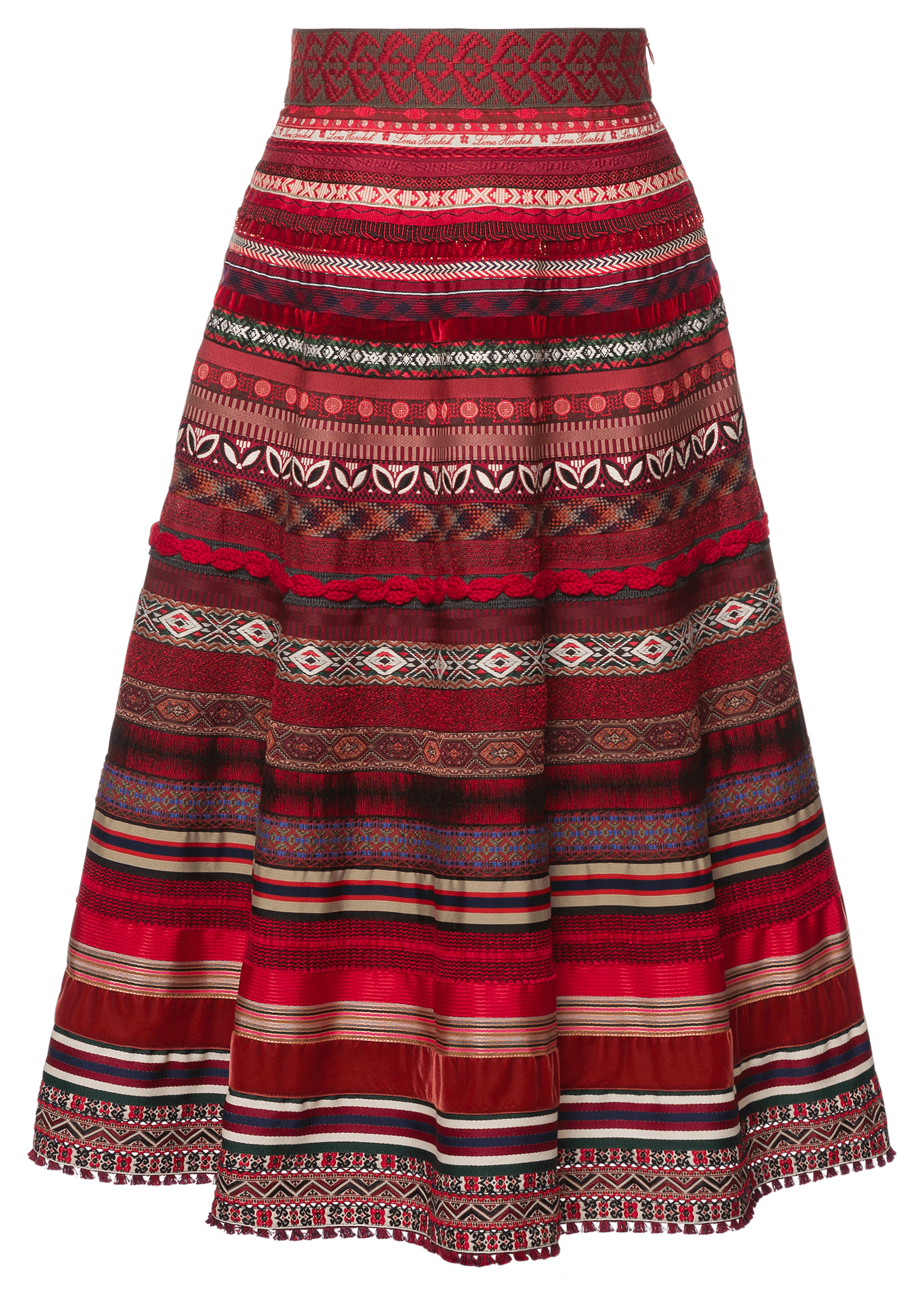 Der Bänderrock Classic MacGregor von Lena Hoschek Tradition vereint klassische Eleganz mit verspielten Details. Das gemusterte Taillenband und der weite, lange Schnitt machen den Rock zu einem echten Hingucker, während der Bändermix in kräftigen Rottönen für einen frischen, edlen Look sorgt.