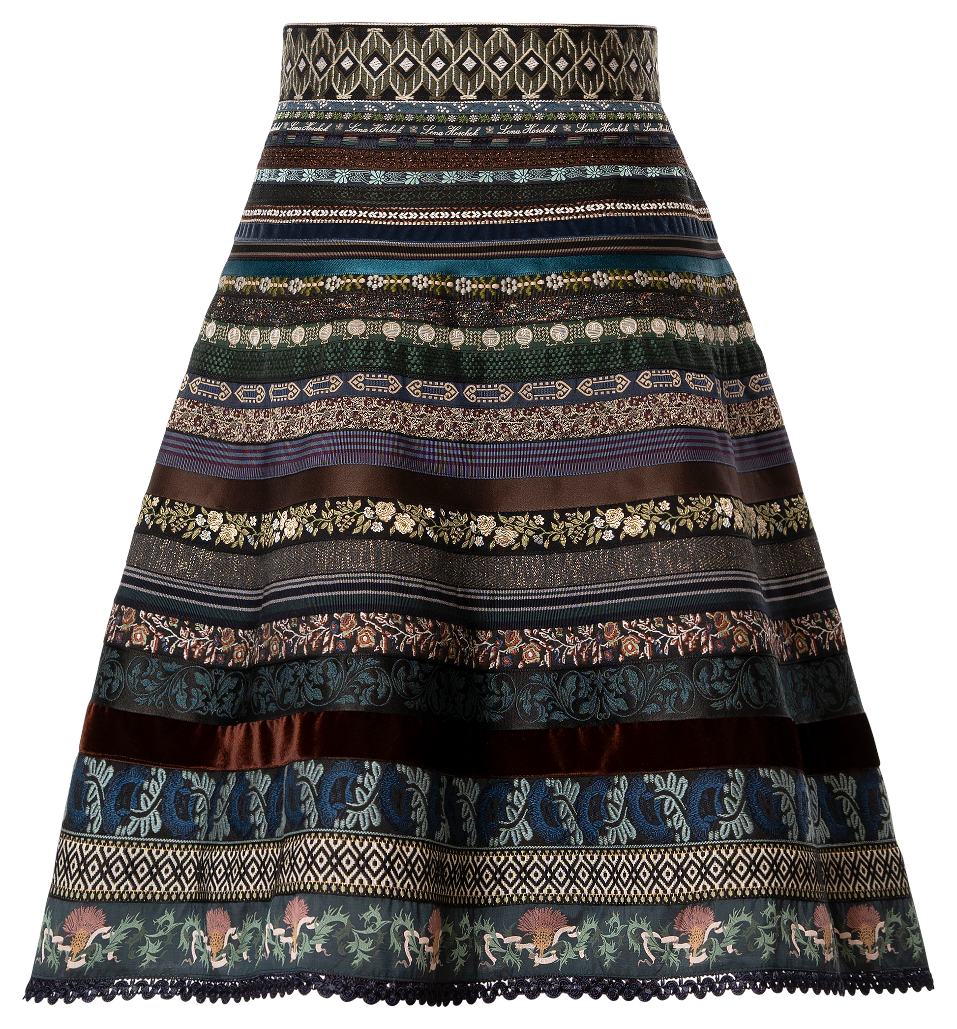 Der Classic Ribbon Skirt Winterwalk aus der Herbst/Winter 2025 Kollektion von Lena Hoschek verbindet traditionelle Handwerkskunst mit femininer Eleganz. Der breite, gürtelartige Bund formt die Taille perfekt, während feine Spitzenapplikationen am Saum dem Rock einen zarten, romantischen Akzent verleihen.