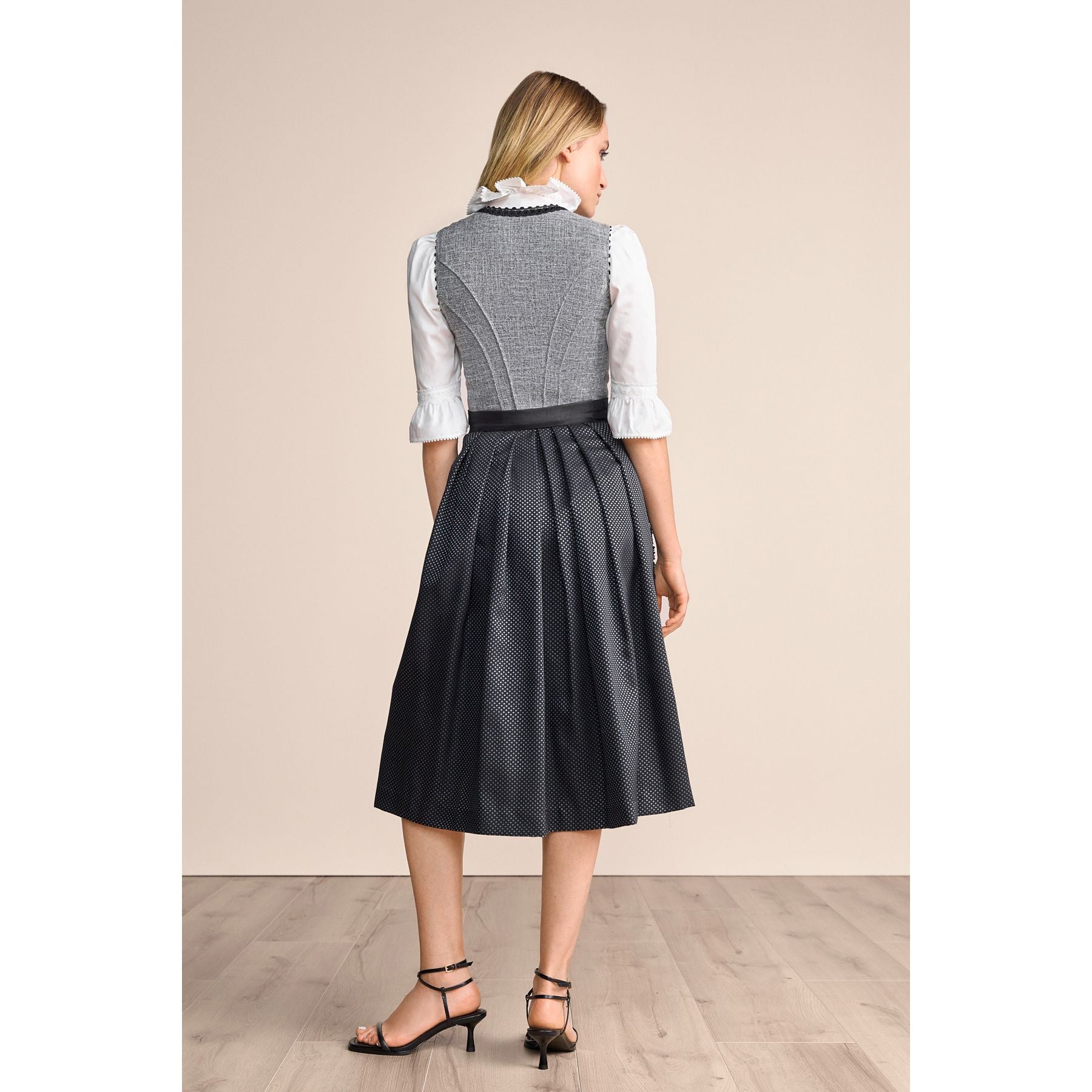 Klassisches Krüger Dirndl in schwarz/grau. Es hat eine Spitzenschürze die mit Perlen & Glitzer verziert ist. Die Rocklänge beträgt 70cm.