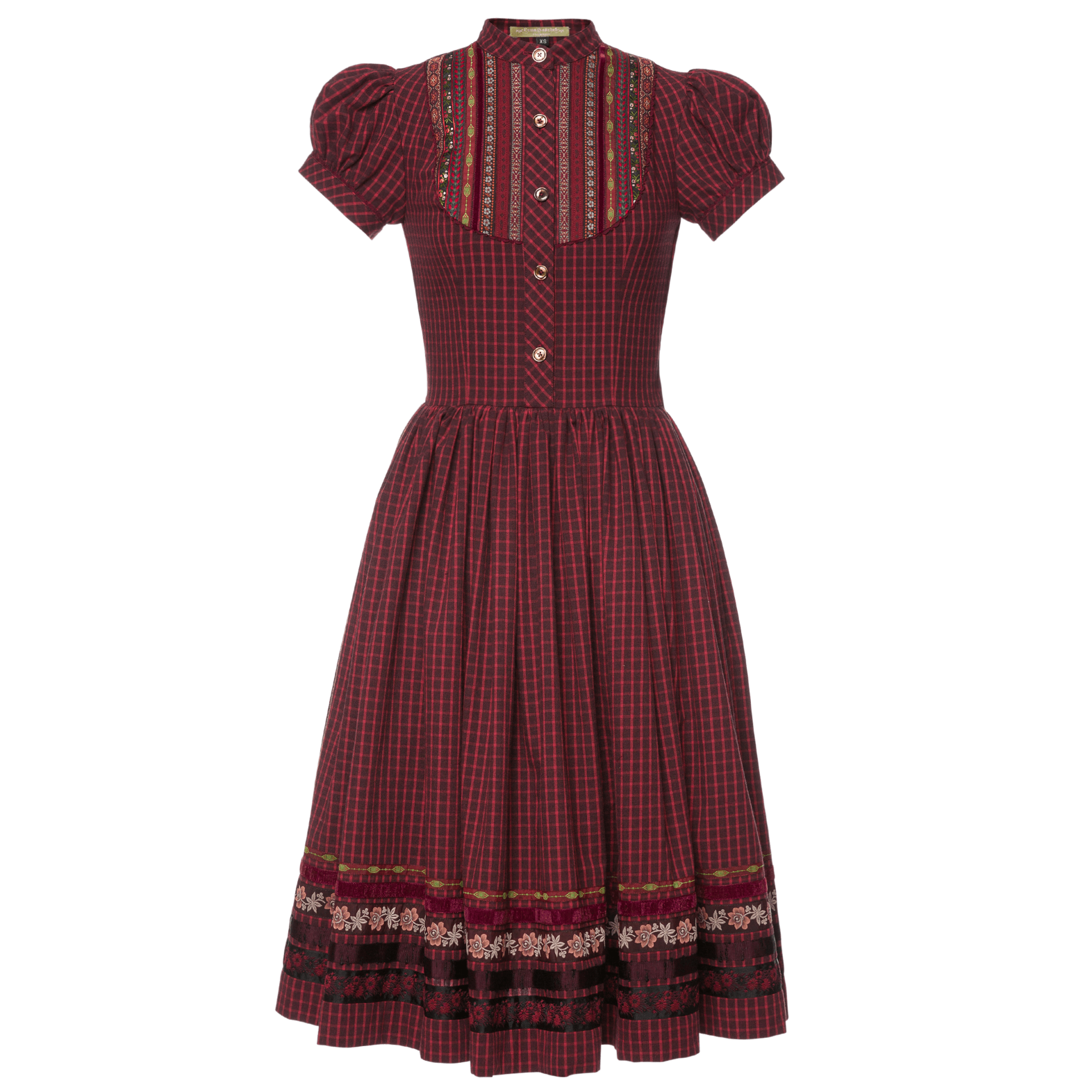 Klassisches Gretl Kleid von Lena Hoschek. Es hat ein karriertes Muster und ist vorne im Brustbereich & am Rockende mit verschiedenen Borten verziert. Es hat Puffärmel und seitlich einen Reißverschluss.