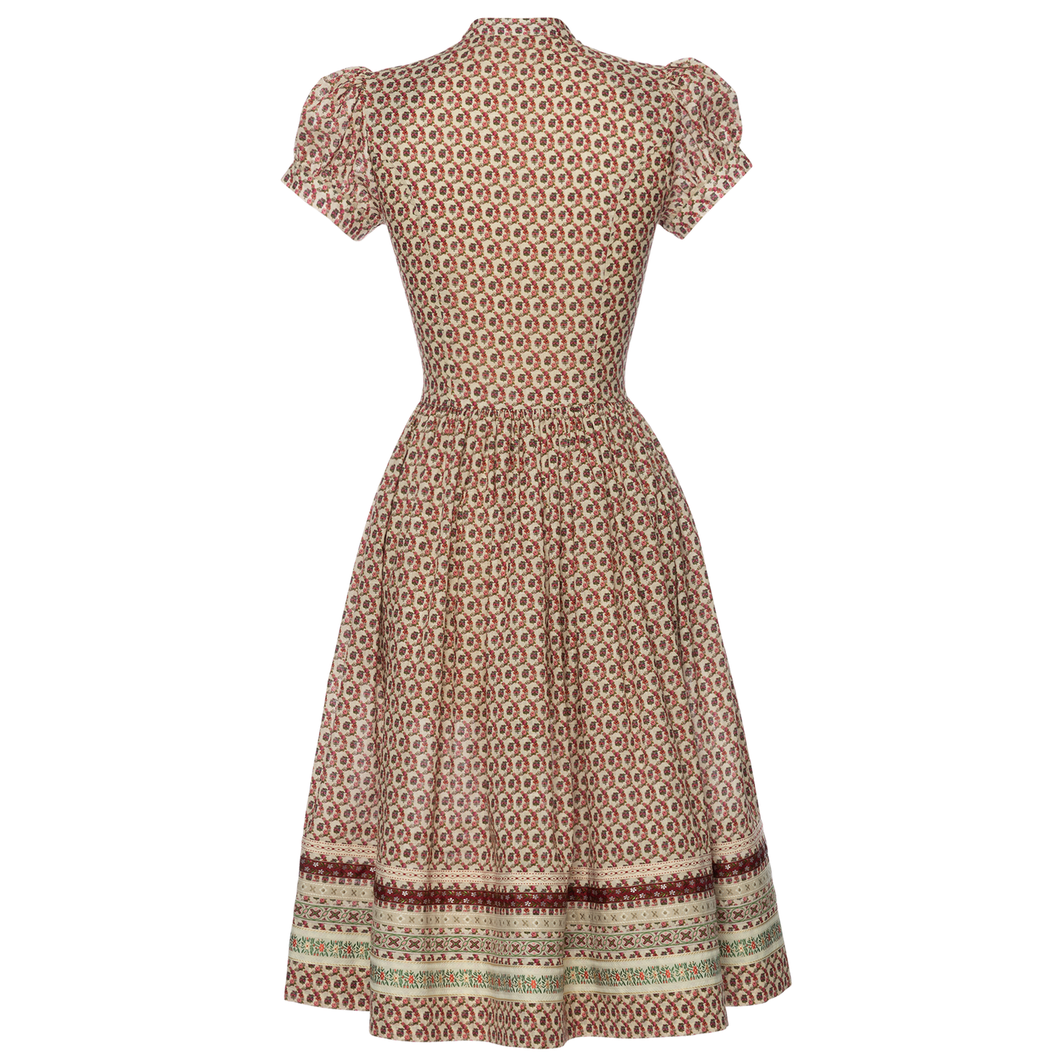 "Das Gretl Kleid Blumenstrauß von Lena Hoschek Tradition ist der Inbegriff von Verspieltheit und Tradition. Es ist in creme mit zarten Blümchen gehalten, besitzt ein tailliertes Oberteil mit Knöpfen, kurze Puffärmel, Stehkragen und Latzblende mit Zierbändern. Der volle Rock hat Zierbänder und eine Spitzenborte und schließt mit einem Reißverschluss auf der linken Seite. Ein besonderer Hingucker für besondere Anlässe.