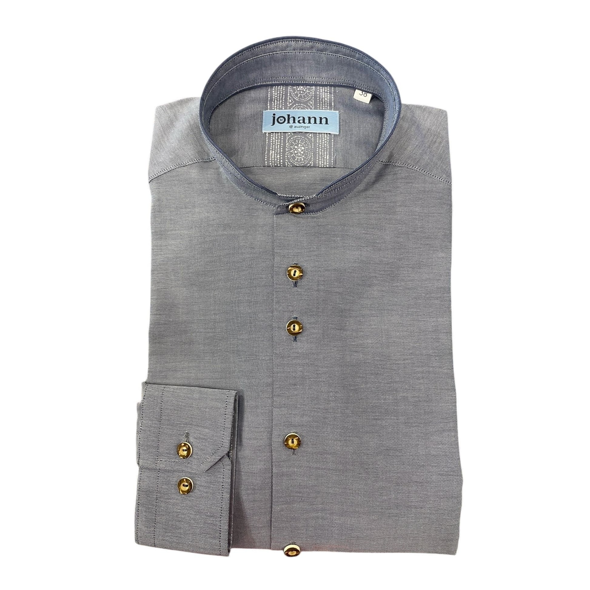 Klassisches Stehkragenhemd in blau von Johann. Es ist normal geschnitten, hat einen Stehkragen & Hirschhornknöpfe.
