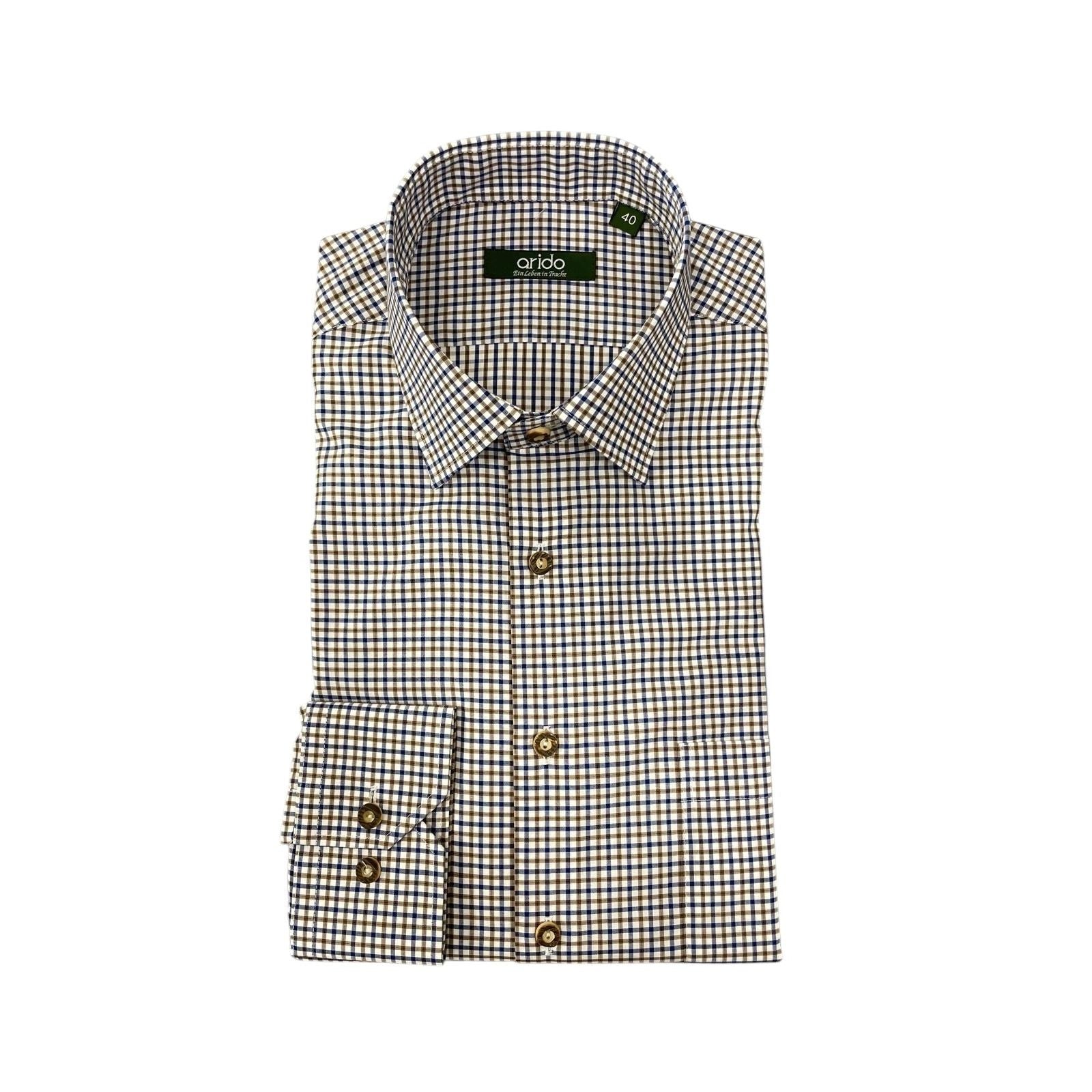 Klassisches Herrenhemd in braun/blau/weiss karriert von Arido. Es ist normal geschnitten & hat lange Ärmel.