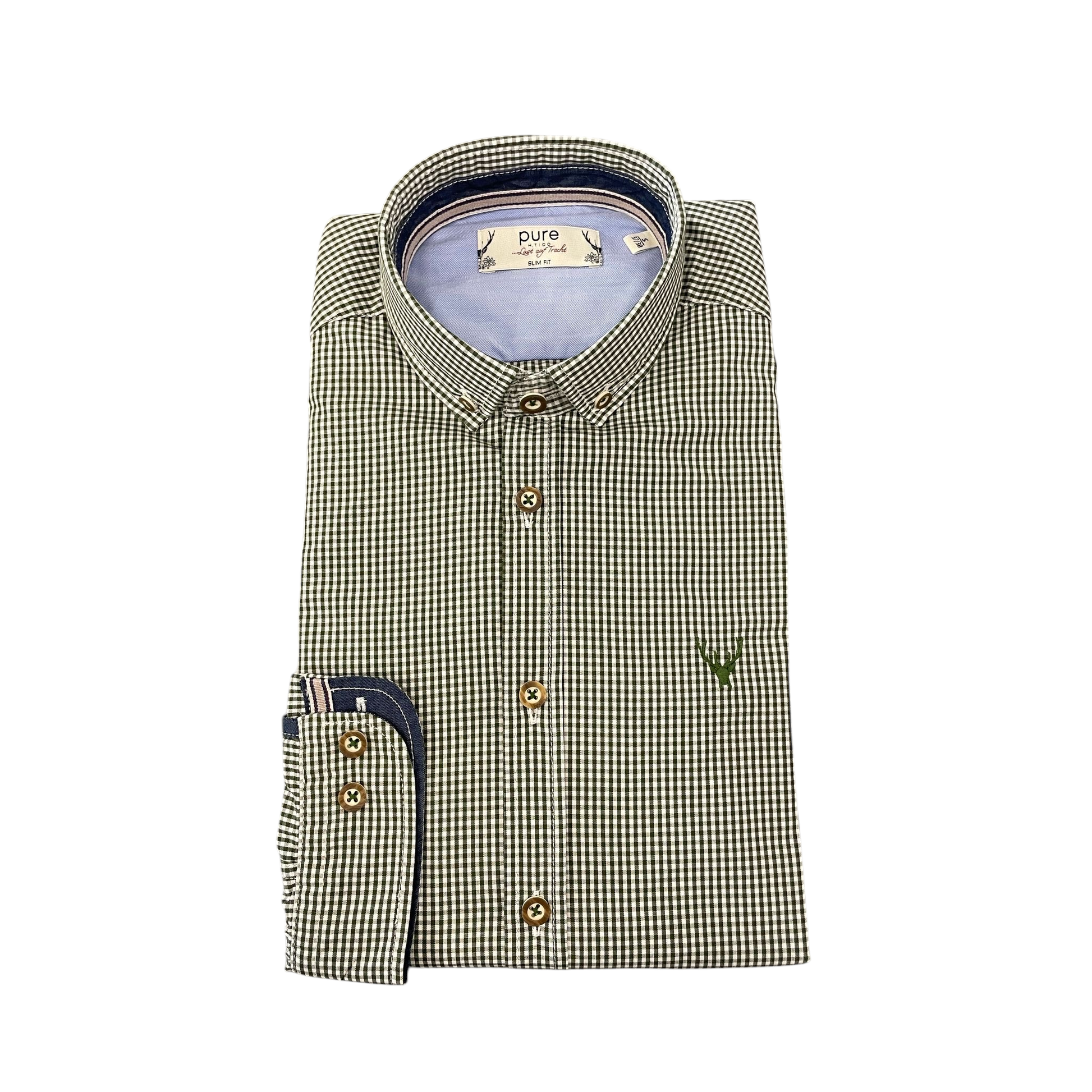 Klassisches Hemd von Pure in grün kariert. Es hat Hirschhorn Knöpfe und einen button down Kragen.