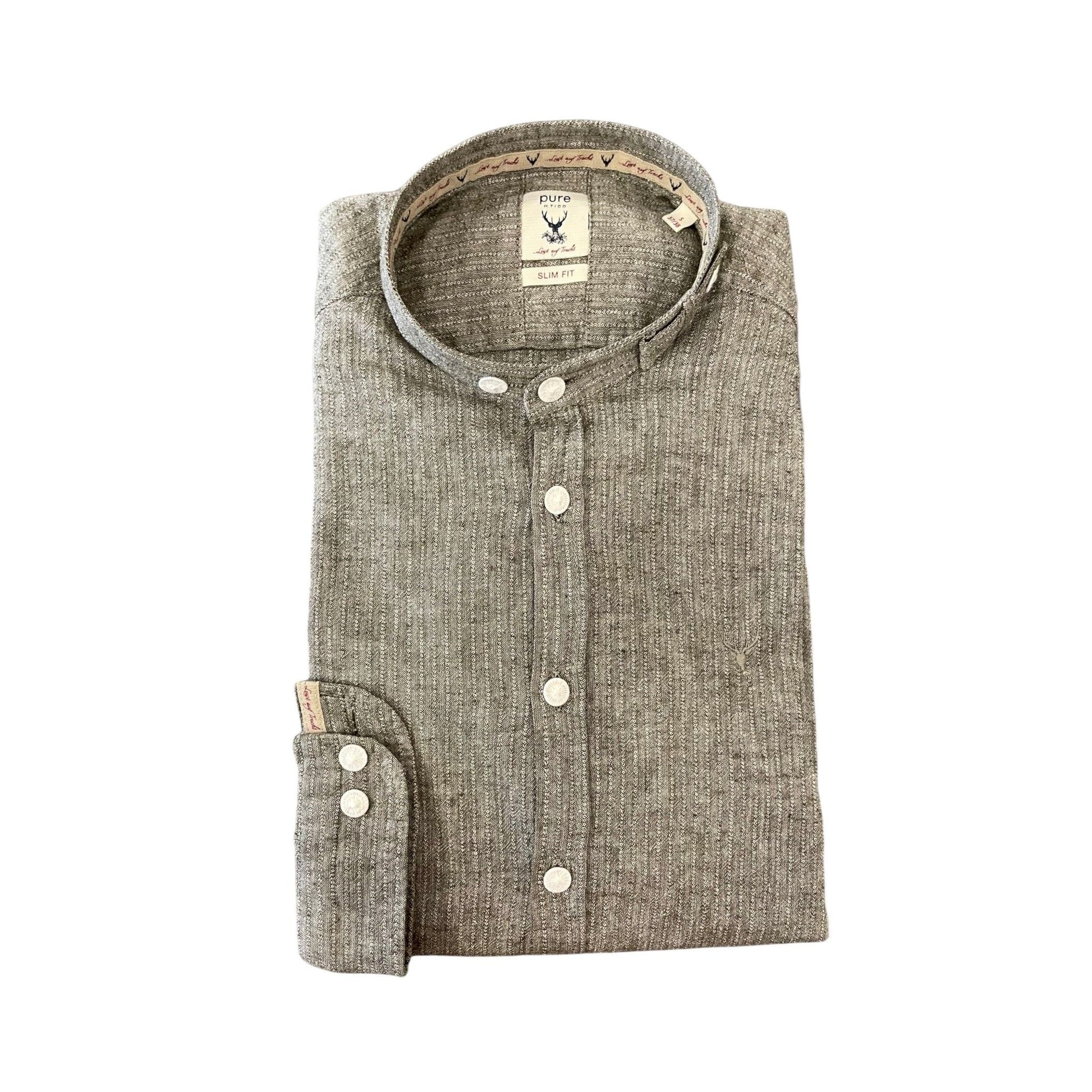 Klassisches Herrenhemd von Pure. Es ist grau/grün und talliert geschnitten.