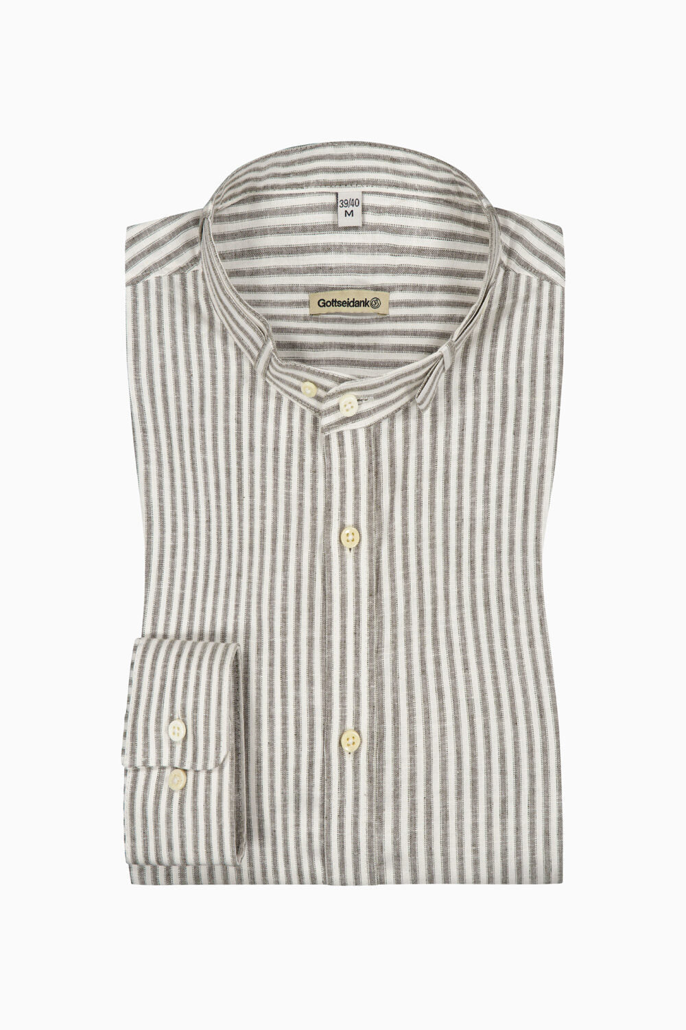 Klassisches Stehkragen Hemd von Gottseidank in oliv. Es ist weiss/oliv gestreift und tailliert geschnitten.