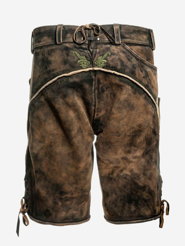 Coole Lederhose Boandlkramer 3D mit grünem Stick inklusive passendem Gürtel mit Logoschnalle.