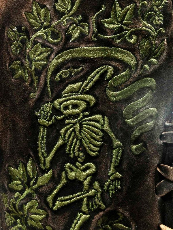 Material: Leder: 100 % Wildbock Vegatabil, Keder: 100 % sämisch Hirsch, Bundleder und Träger: 100 % Rindslederlining, Innenfutter: 100 % Baumwolle
