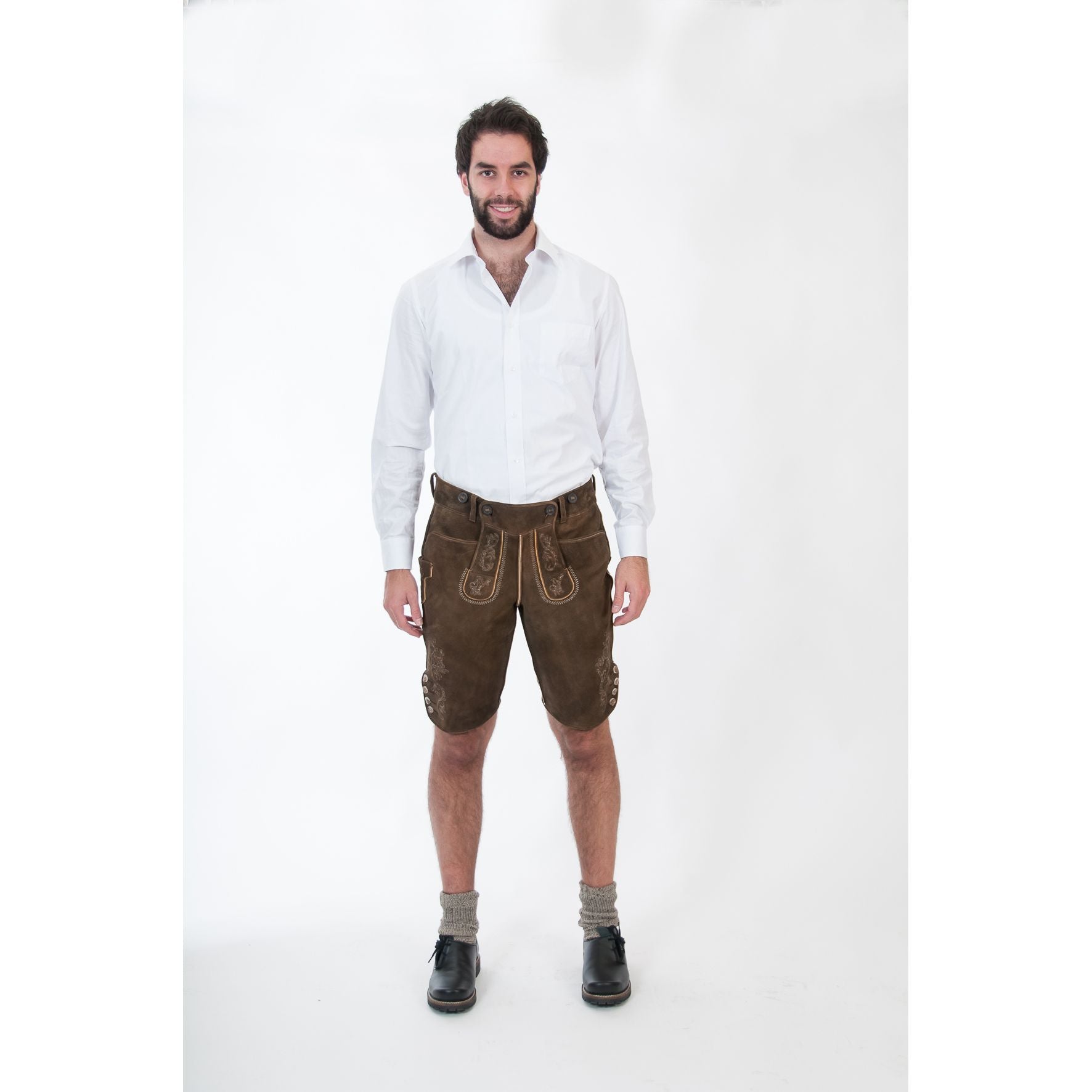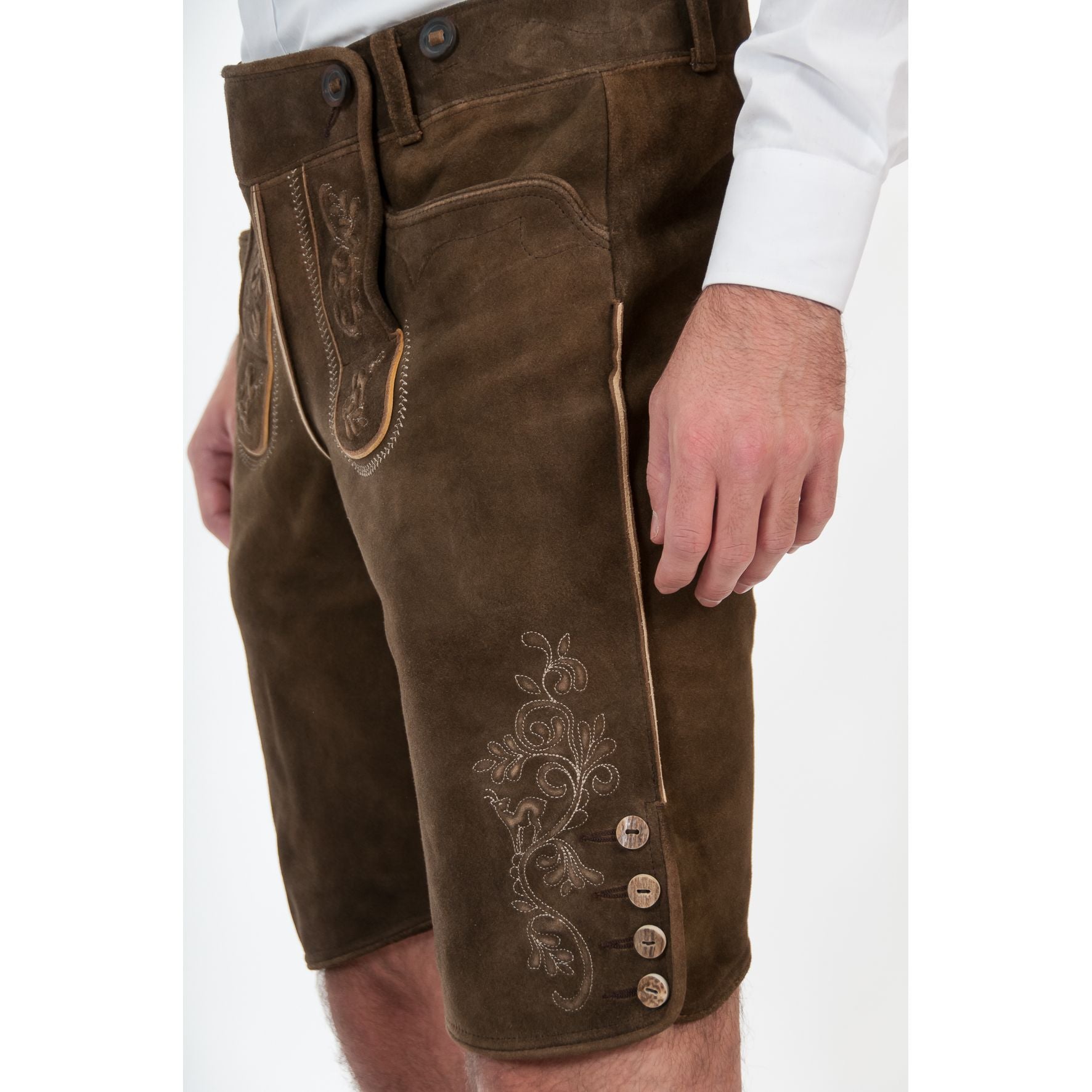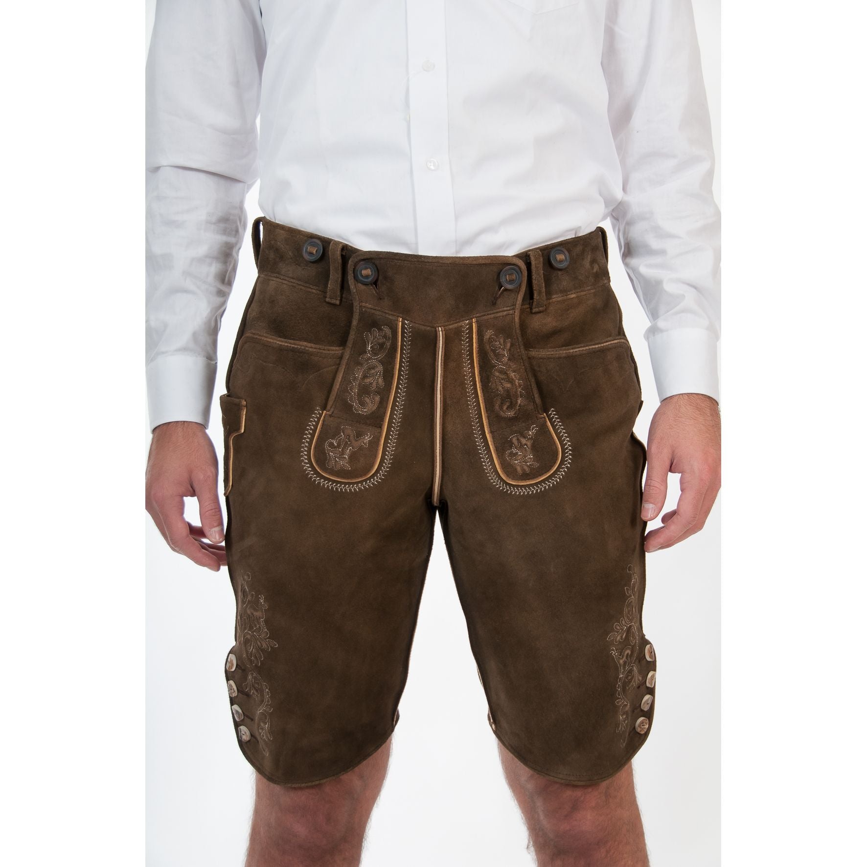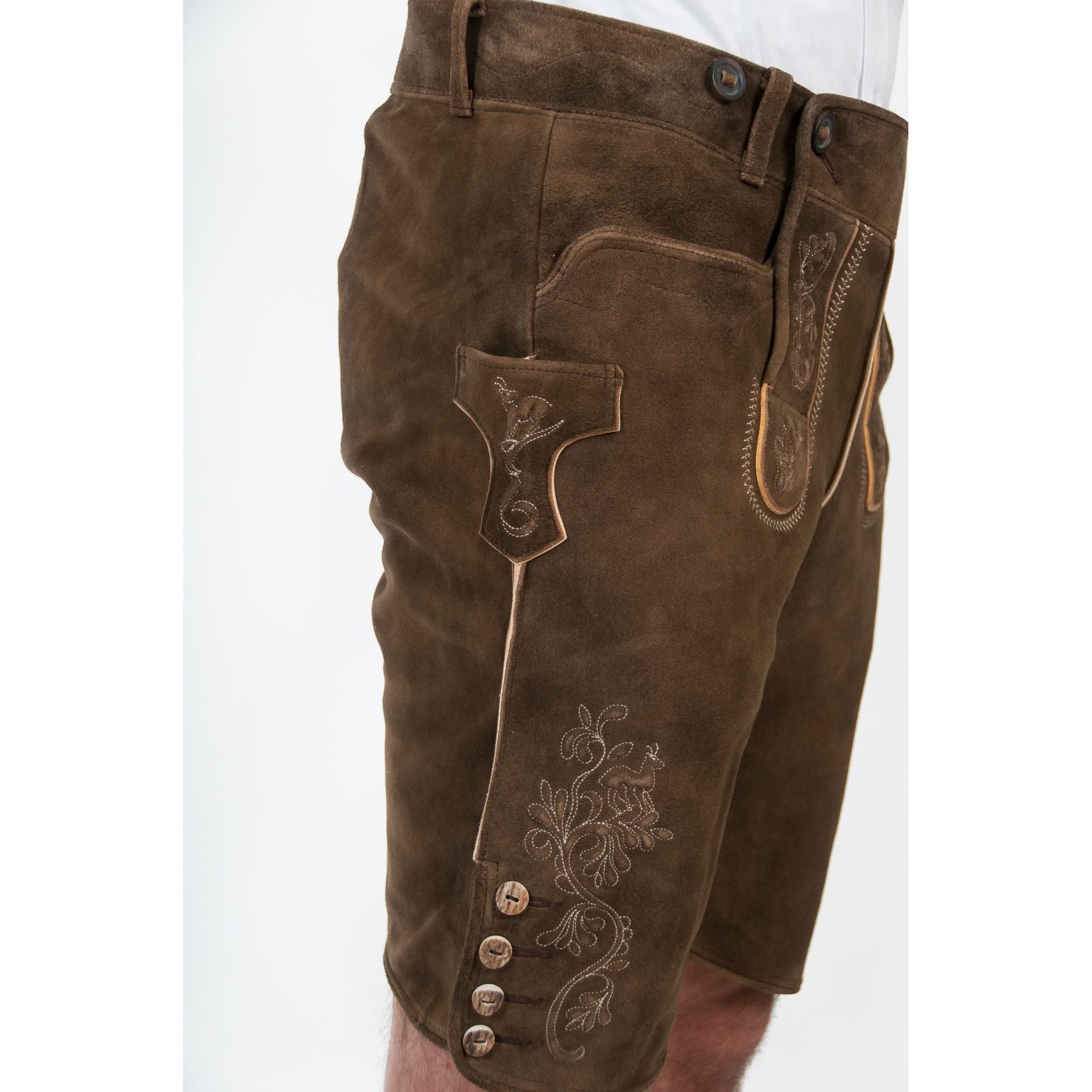 Klassische Braune Lederhose der Firma Meindl aus Ziegenleder in der Farbe bisam mit schönem Stick und Holzknöpfen.