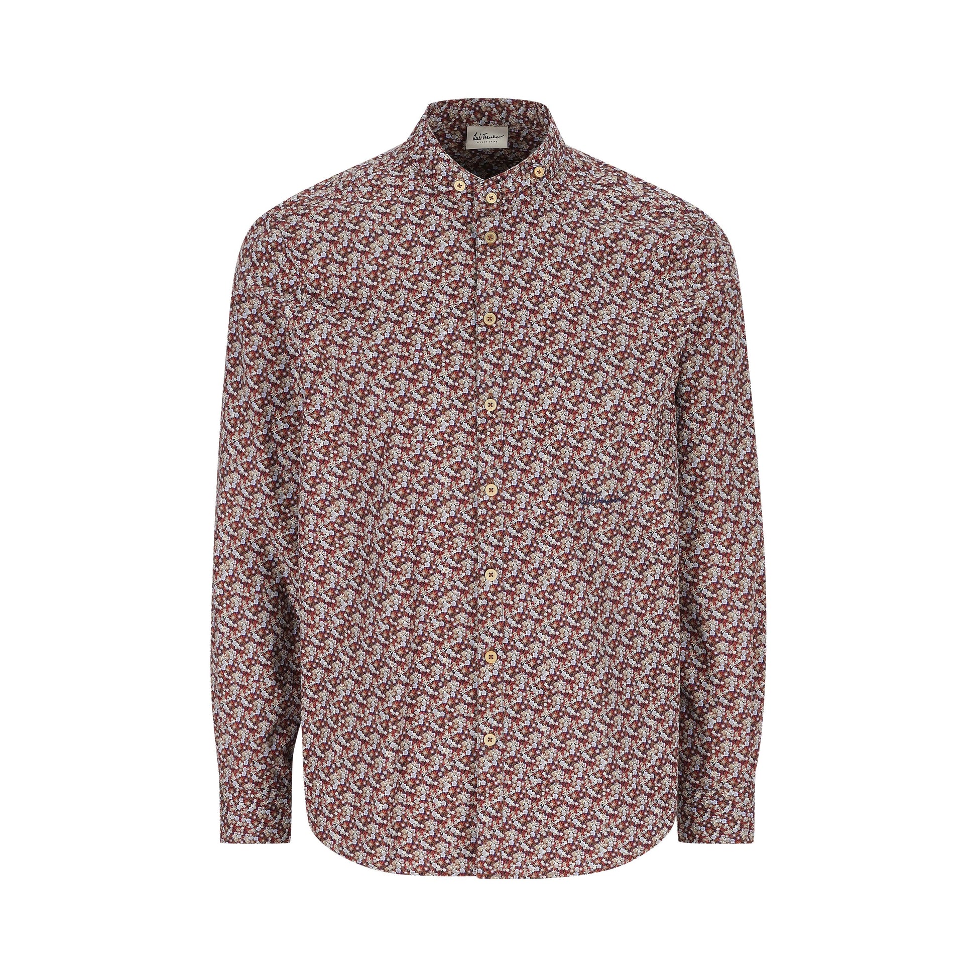 Dieses stilvolle Langarmhemd überzeugt mit einem fein gemusterten Blumenprint in warmen Braun- und Blautönen – ein echter Blickfang für modebewusste Männer. Der moderne Stehkragen verleiht dem Hemd eine besondere Note und macht es zur perfekten Wahl für lässige wie auch stilvolle Anlässe.