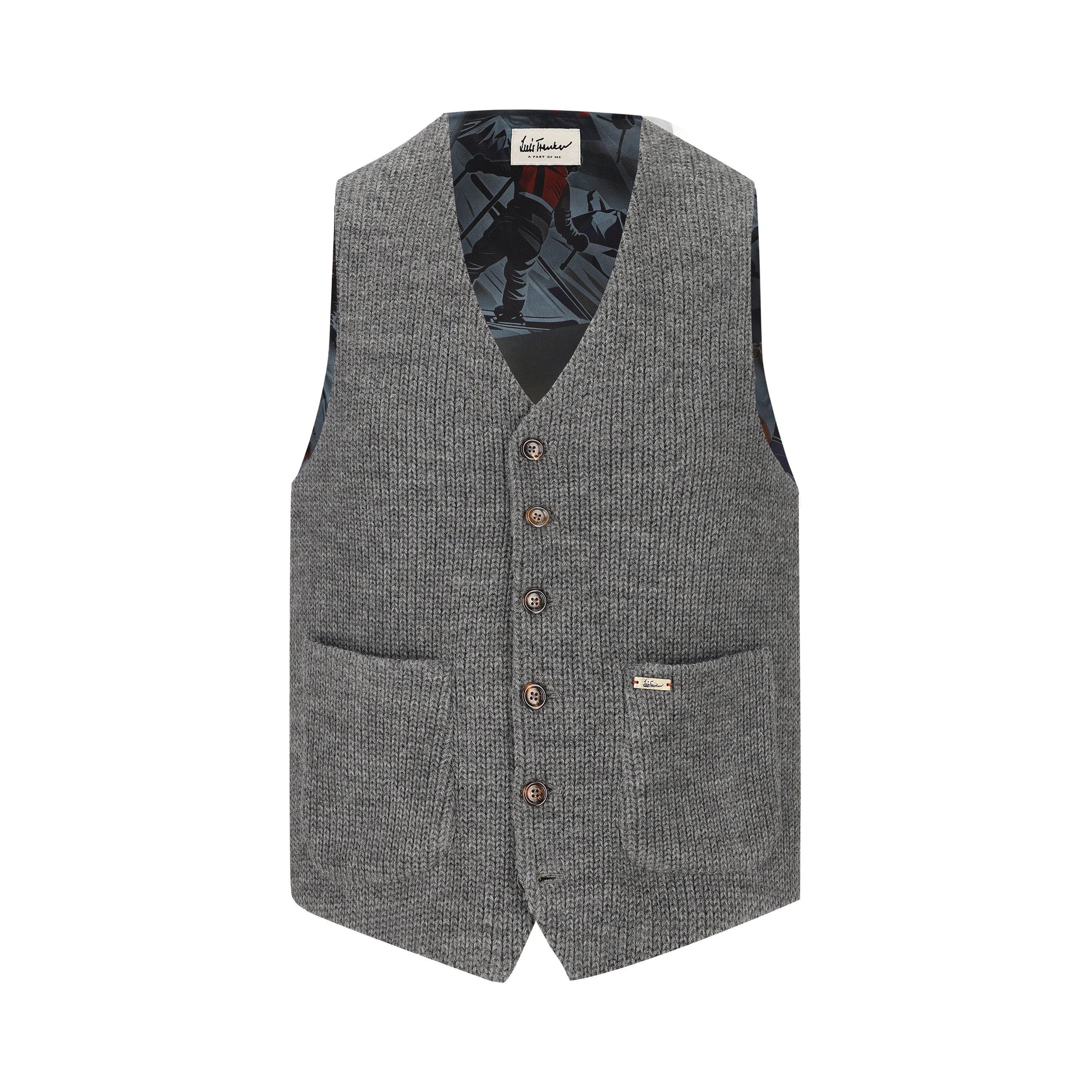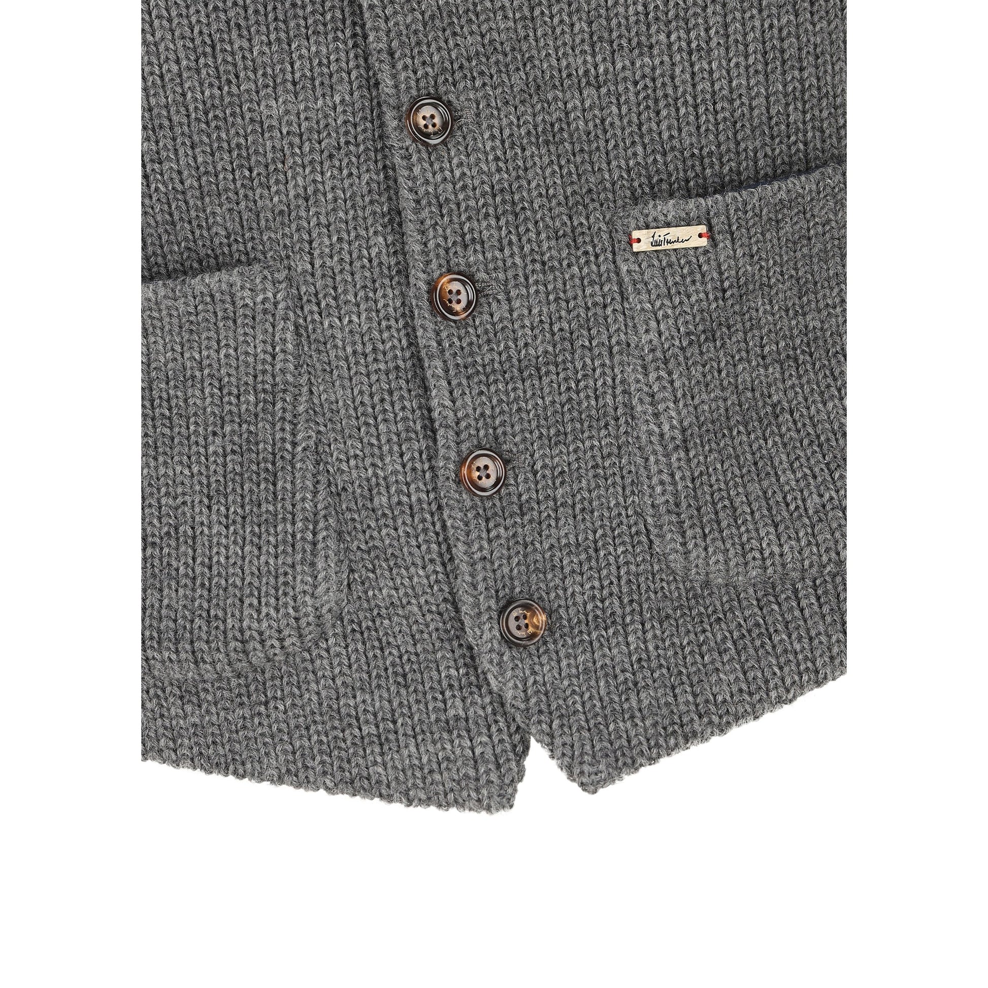 Diese hochwertige Strickweste verbindet rustikalen Charme mit zeitloser Eleganz. Das grob gestrickte Material in einem Grauton verleiht der Weste einen natürlichen Look, während die klassische Knopfleiste und die zwei aufgesetzten Taschen für Funktionalität und Stil sorgen.