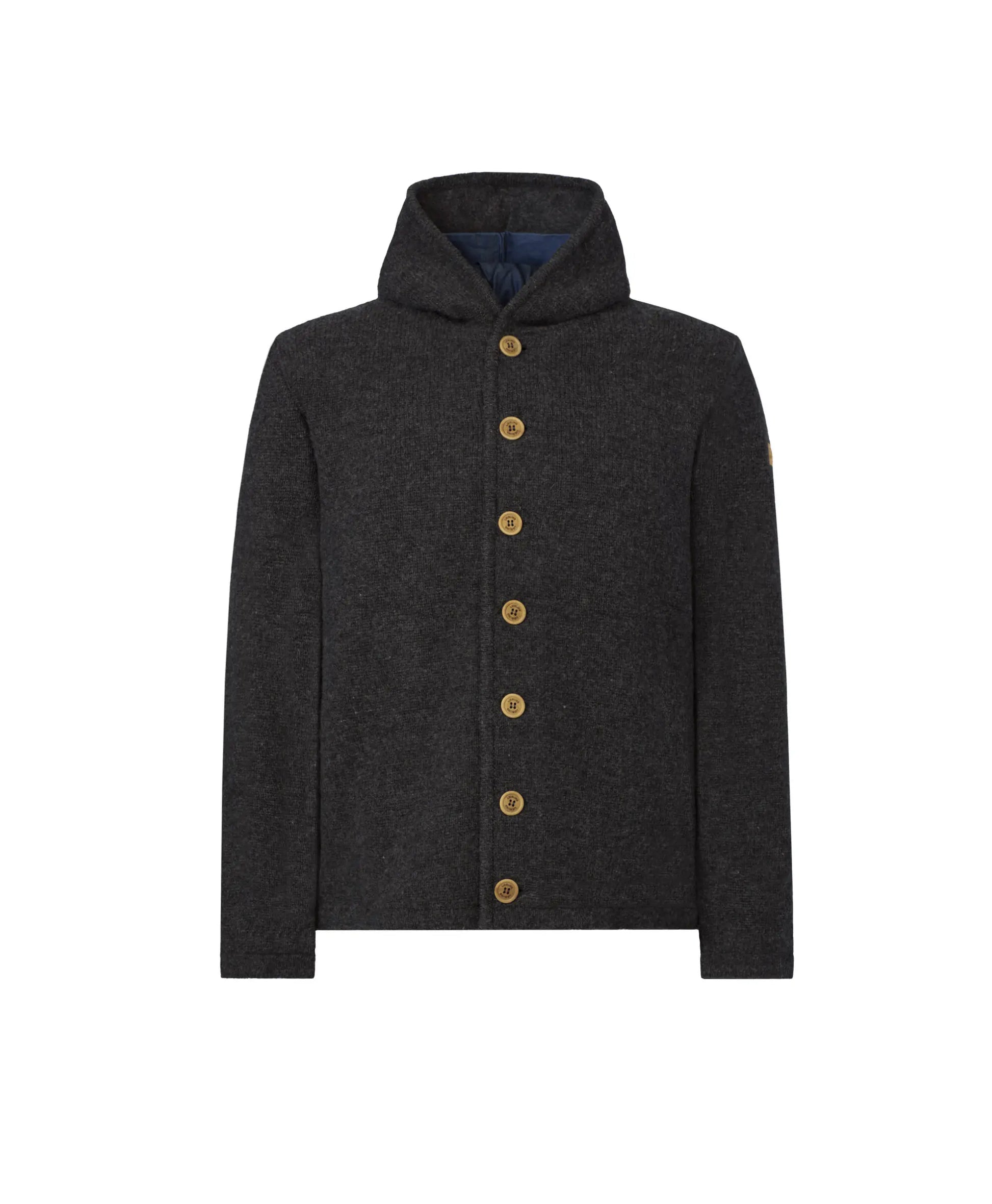 Gefütterte Strickjacke mit Kapuze. An der Vorderseite ist die Jacke verziehrt mit hellen Knöpfen und der Aufschrift "Liebling"