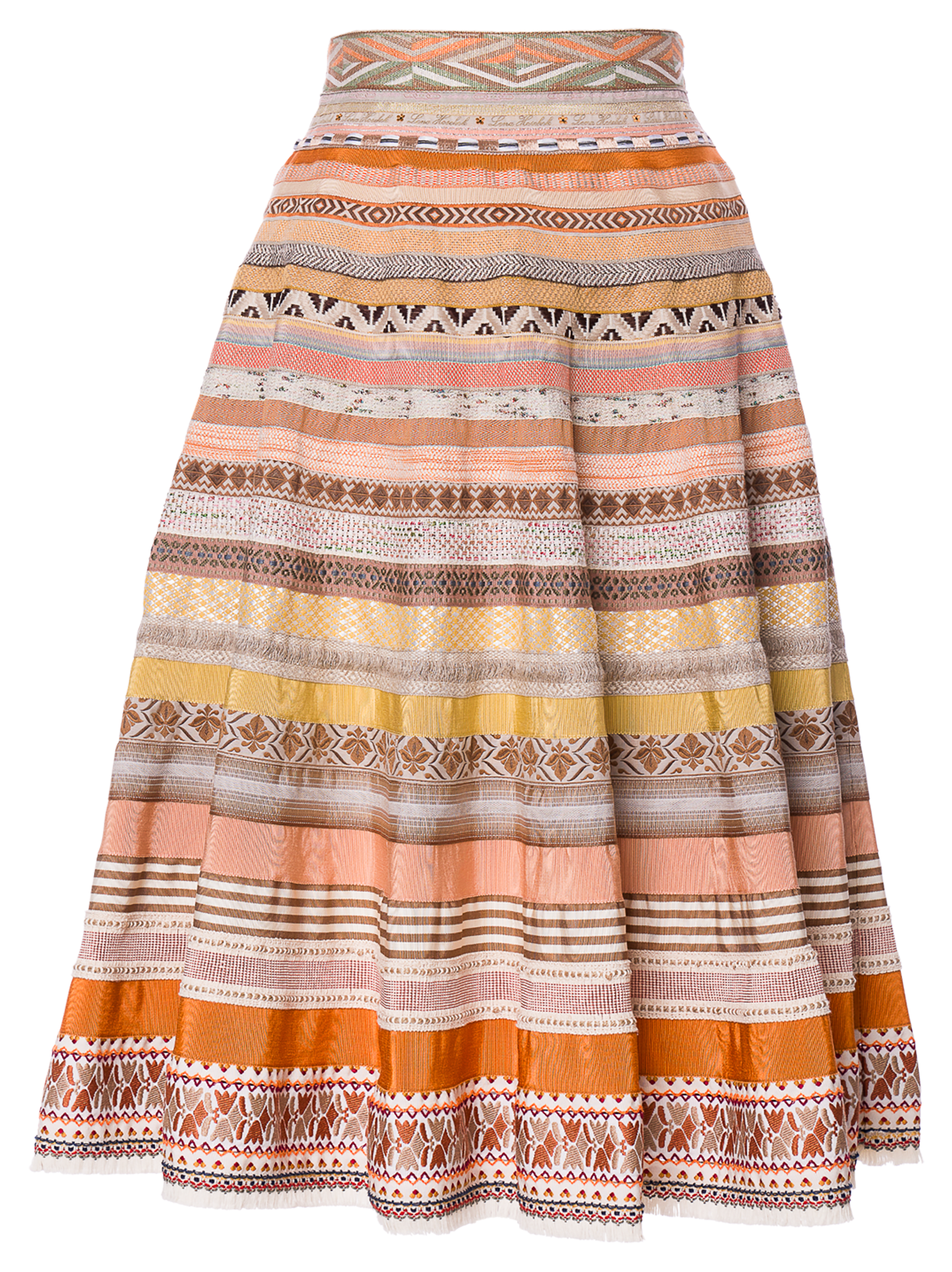 Dank des seitlichen Reißverschlusses lässt sich der Rock mühelos an- und ausziehen. Jedes Stück ist ein Unikat, da einzelne Musterbänder in Farbe und Anordnung leicht variieren können – ein Ausdruck echter Handwerkskunst und Individualität.