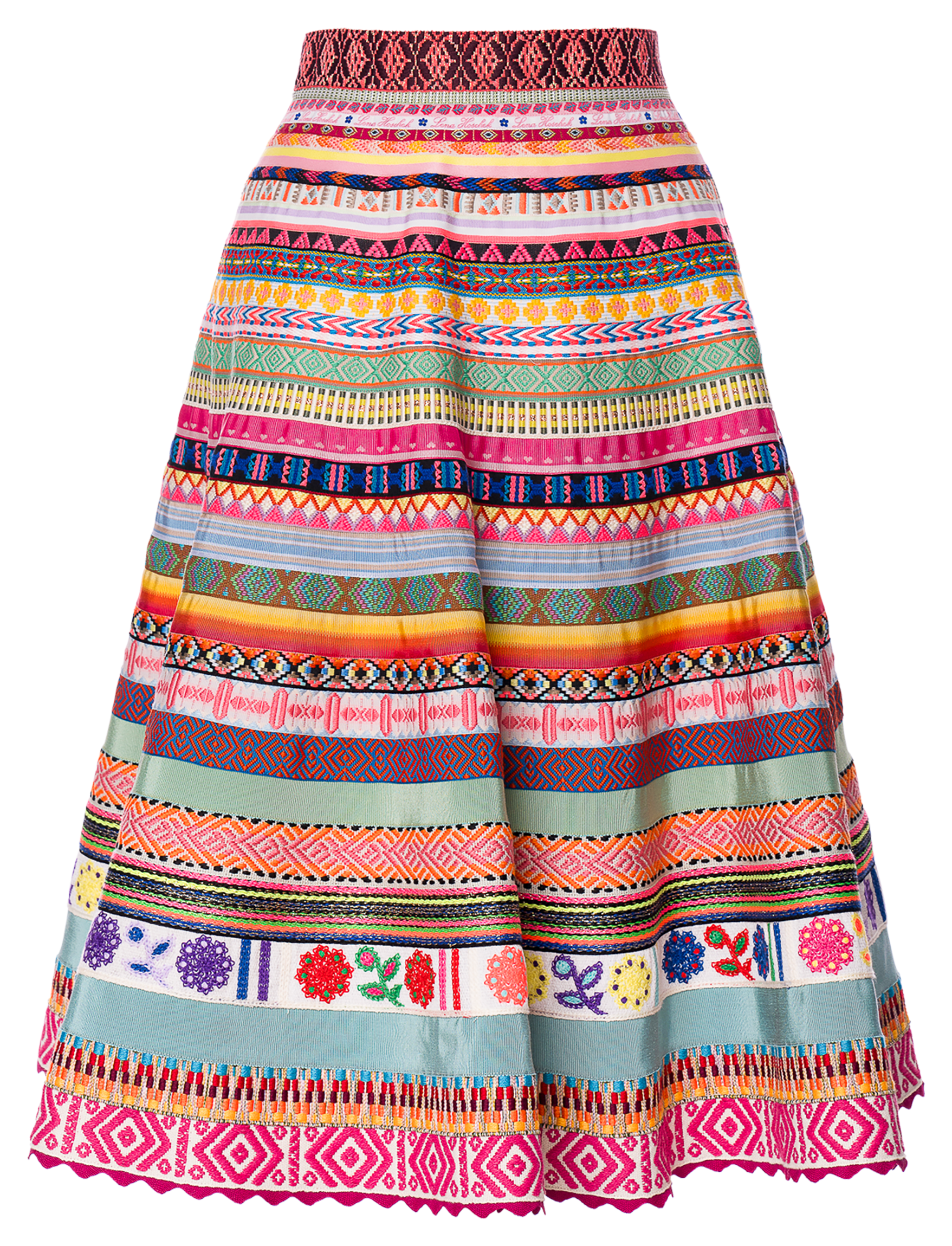 Der Bänderrock Original Pride von Lena Hoschek ist das perfekte Sommer-Statement! Die lebhaften, bunten Bänder und dekorativen Musterbänder zaubern einen verspielten, auffälligen Look, der sofort ins Auge fällt.