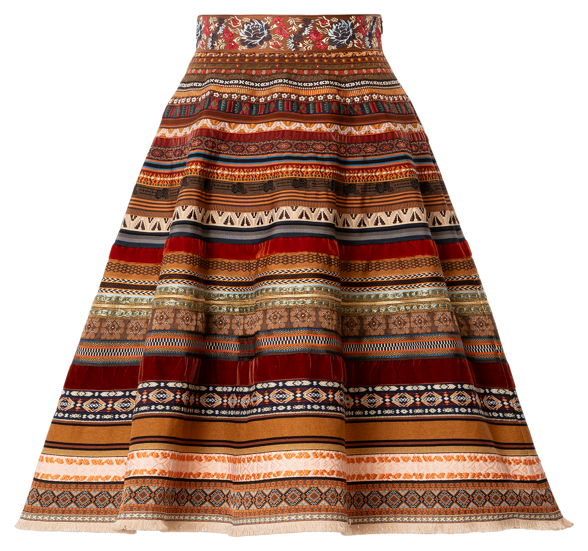 Der Traditional Ribbon Rock aus der Herbst/Winter 2025 Kollektion von Lena Hoschek vereint klassische Eleganz mit traditioneller Handwerkskunst. Traditionelle Stoffbänder und ein fransenverzierter Saum verleihen dem Rock einen femininen, verspielten Charakter. Ein stilvolles Statement, das die Ursprünge des traditionellen Rocks auf moderne Weise ehrt.