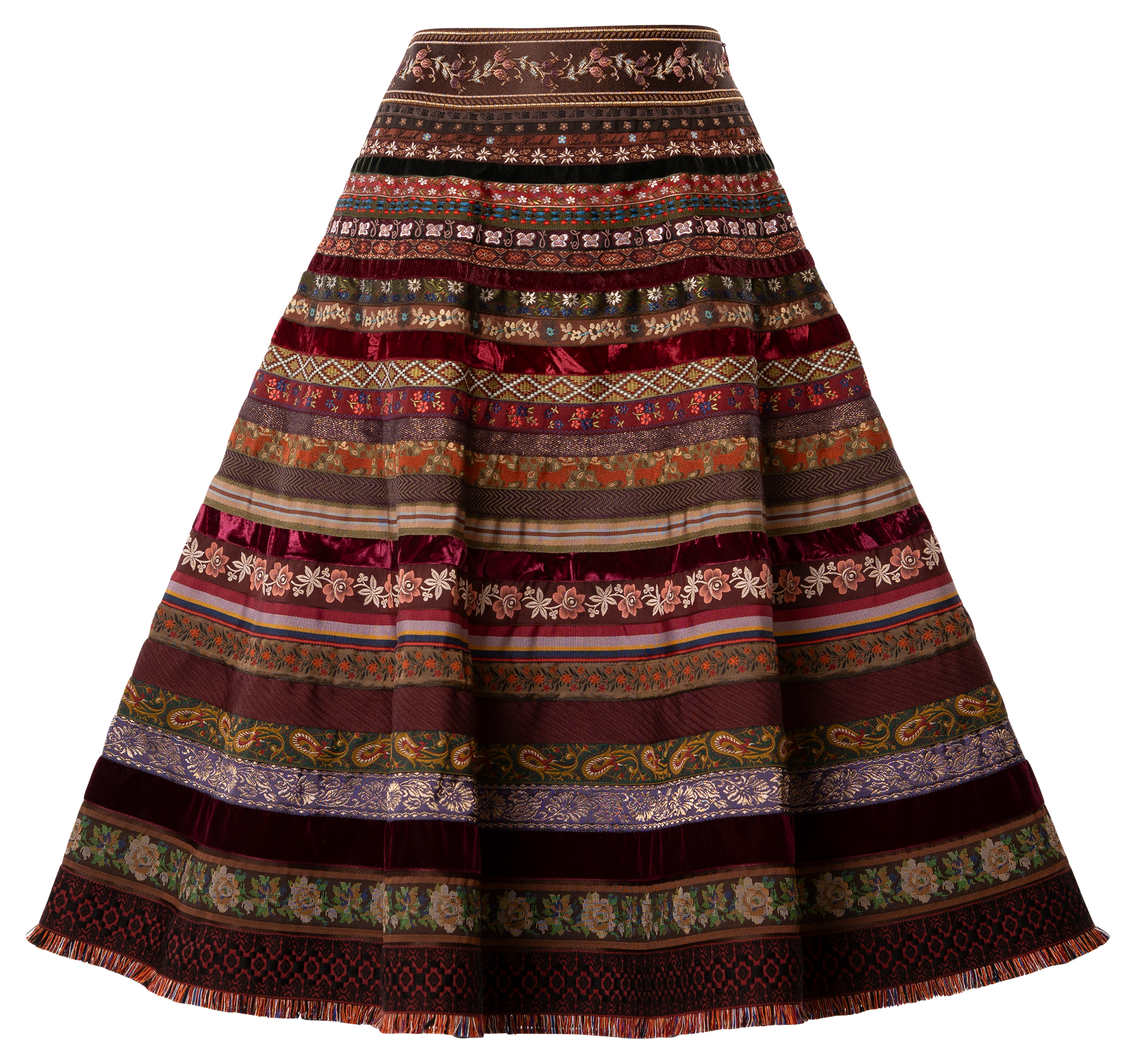 Der Traditional Ribbon Rock aus der Herbst/Winter 2025 Kollektion von Lena Hoschek ist ein klassischer Bänderrock, der traditionelle Stoffbänder mit einem fransenverzierten Saum kombiniert. Ein stilvolles Statement, das die Ursprünge des traditionellen Rocks ehrt und zugleich feminine Eleganz ausstrahlt.