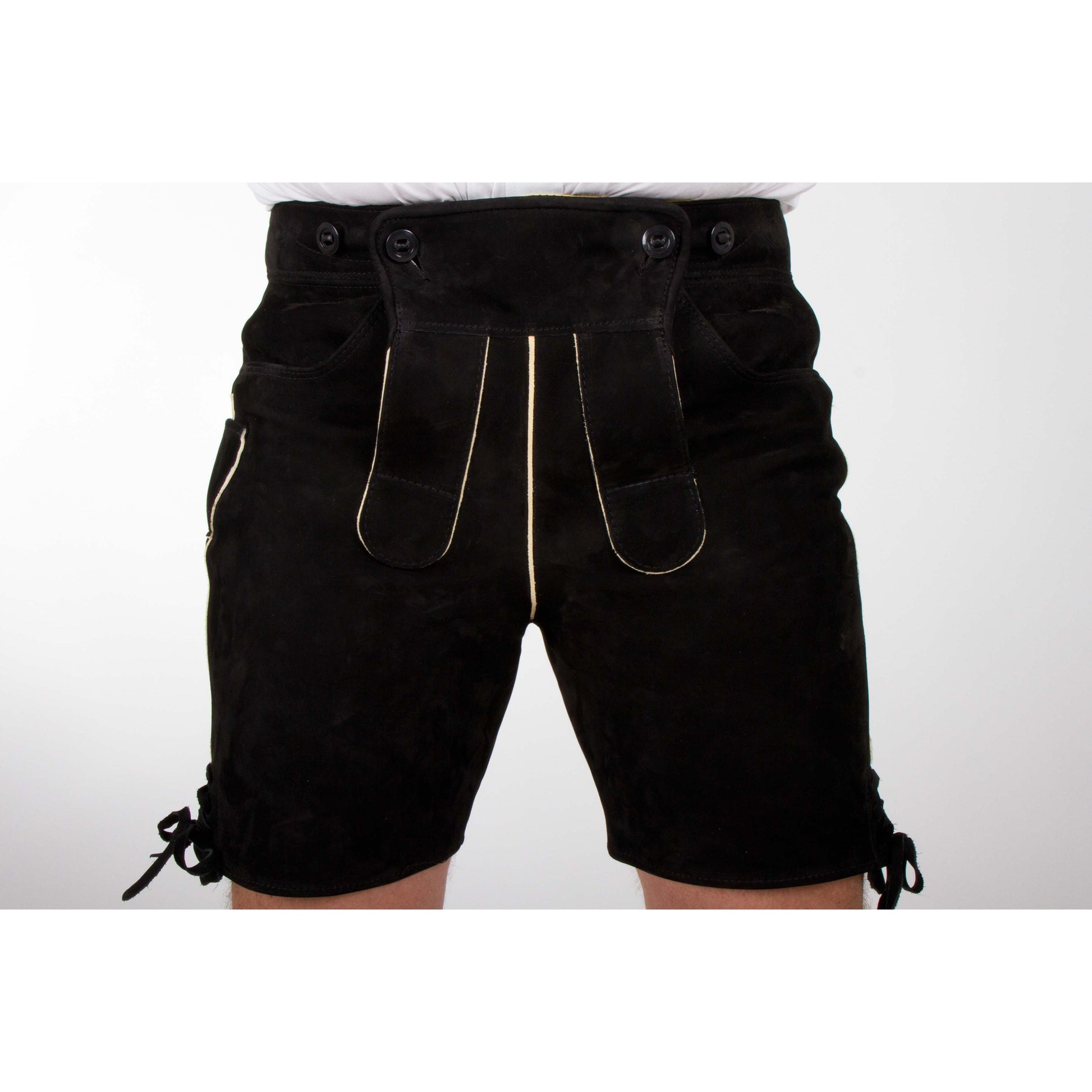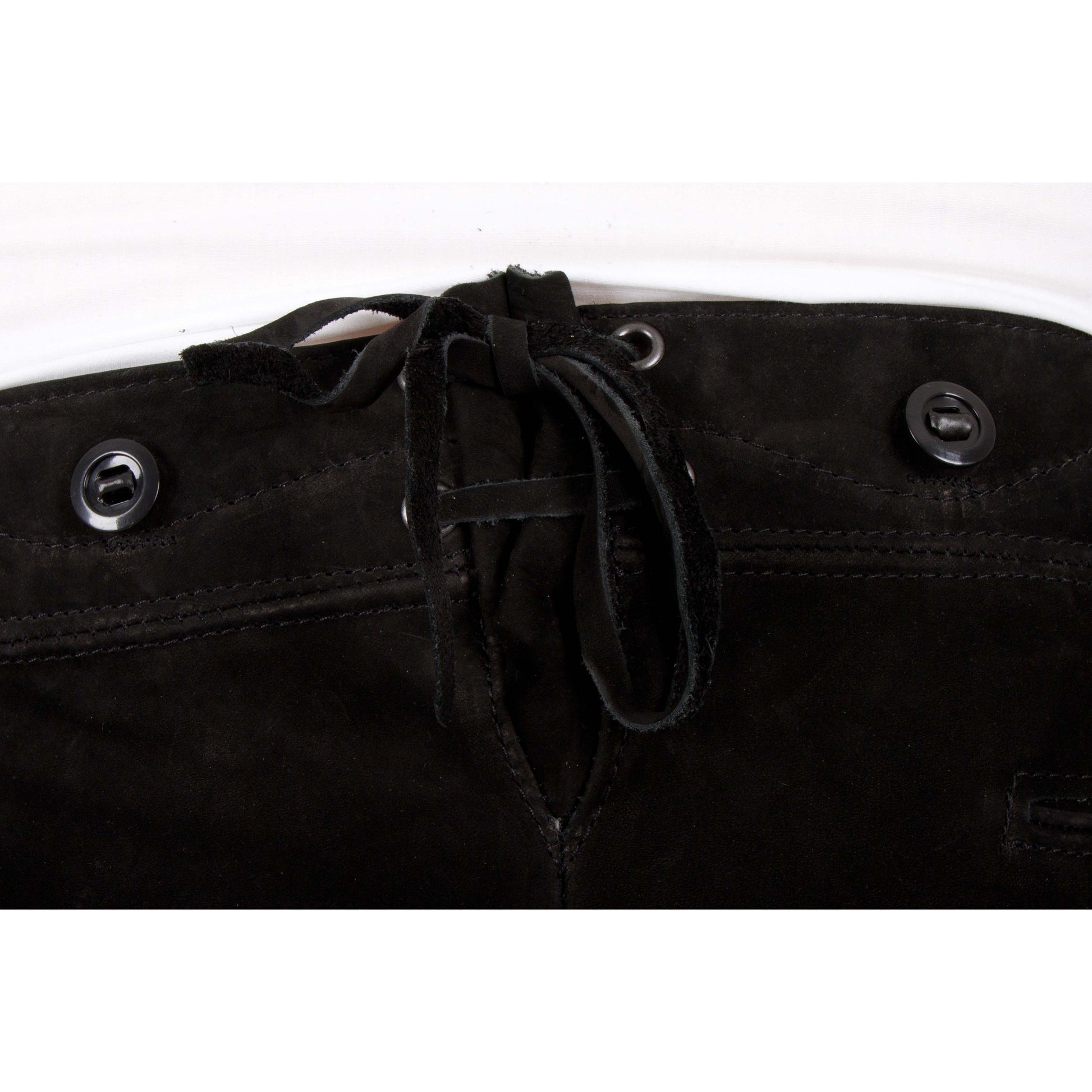 Unsere Plattler Lederhose mit Bändern auf der Seite. Ohne Träger und ohne Stick. Das Leder ist biologisch gegerbt und besonders hautfreundlich. Die Hose wird speziell für uns bei einem Säckler im Alpenraum produziert. Laponialeder in schwarz