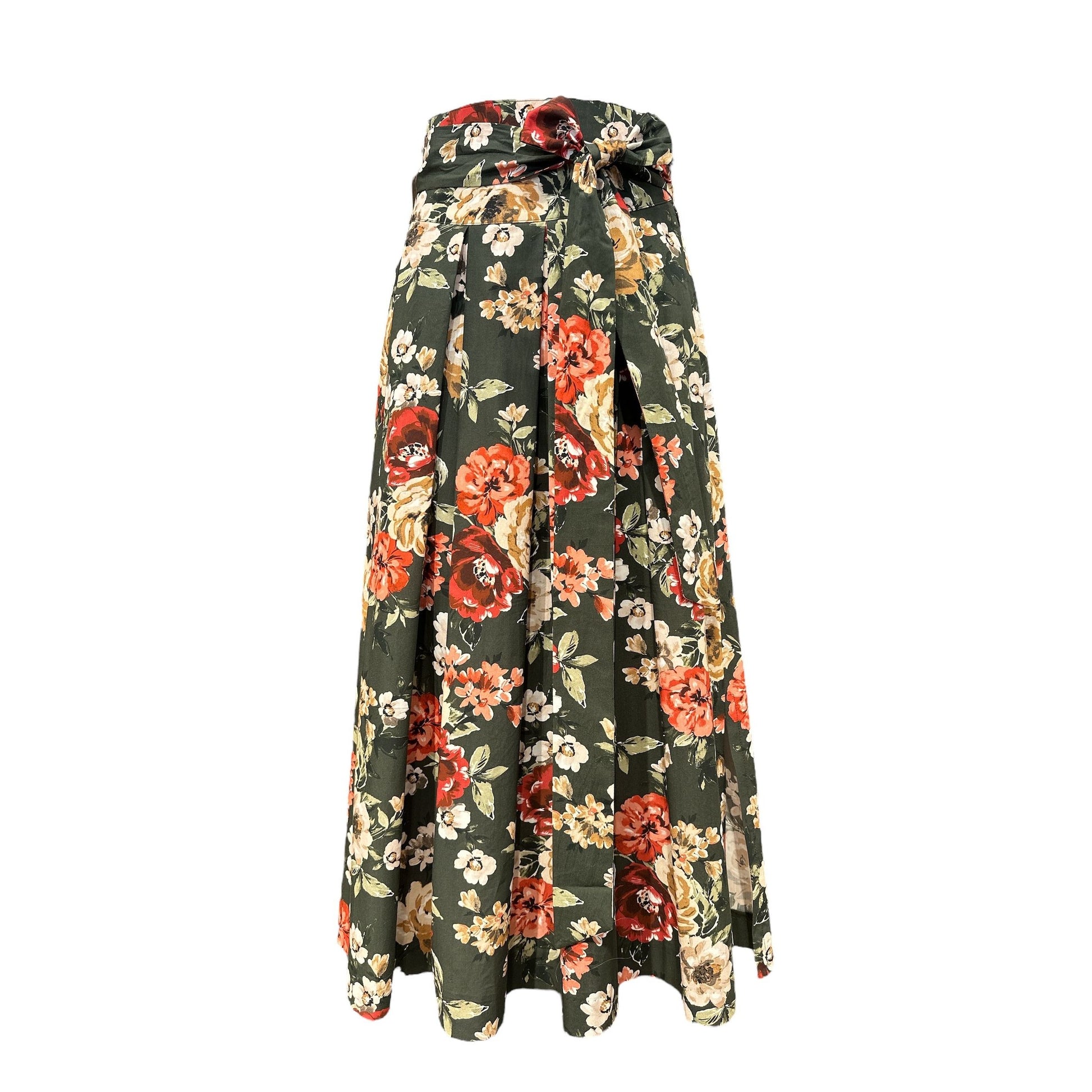 Langer Trachtenrock in oliv von Wenger. Er hat ein florales Muster, ist in Falten gelegt & hat einen Bindegürtel.