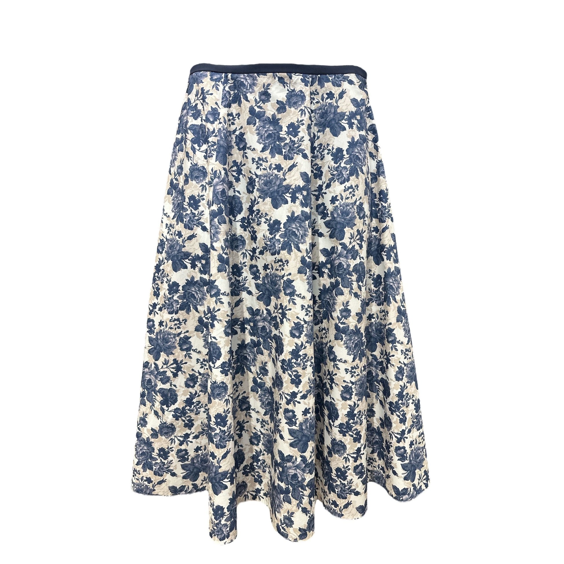 Sommerlicher Trachtenrock von Wenger in weiss/blau. Er ist A-Lien förmig geschnitten & hat einen Reißverschluss.