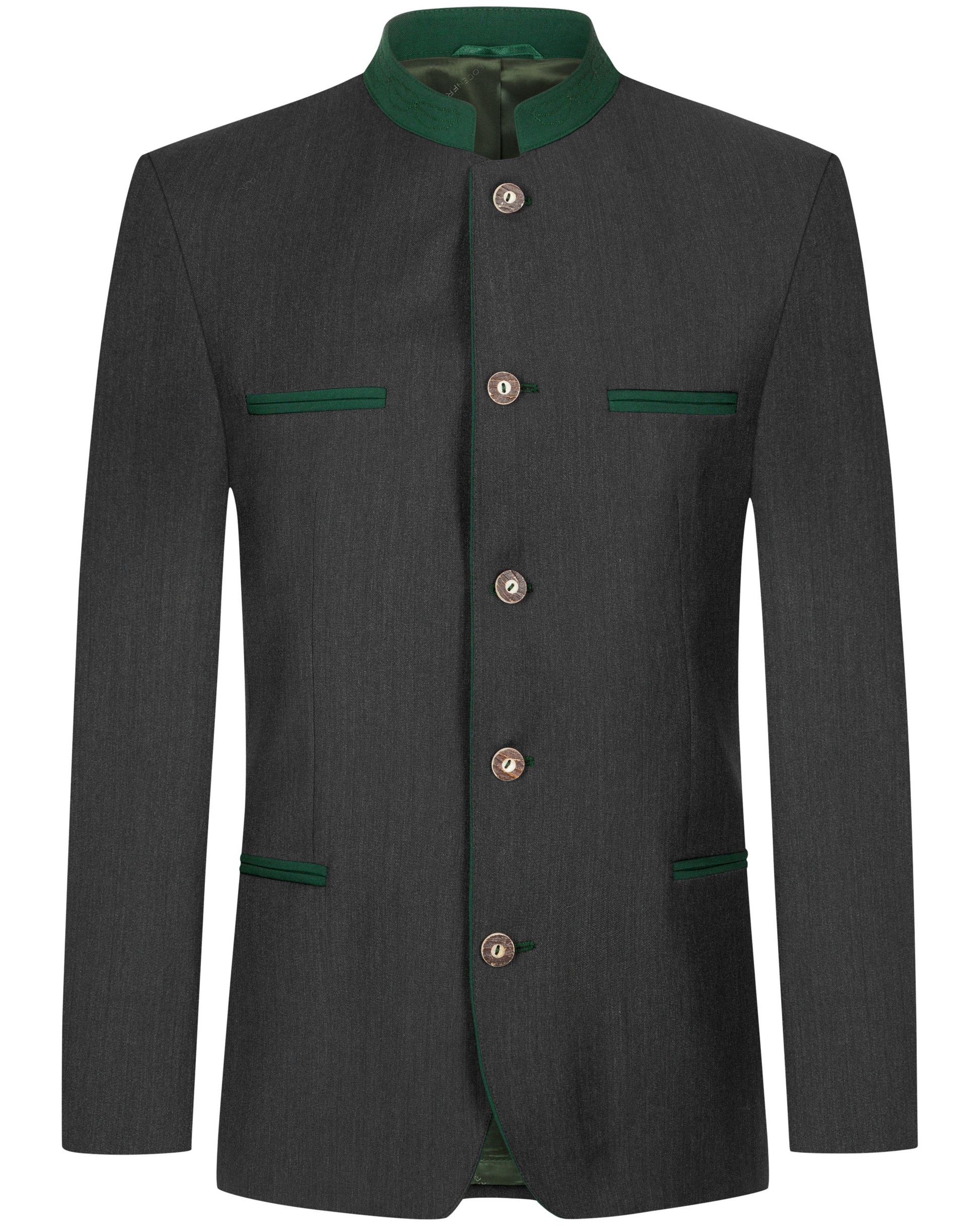 Dieses elegante Trachtensakko vereint zeitlose Tradition mit moderner Eleganz. In edlem Anthrazit mit feinen, grünen Akzenten an Stehkragen und Taschen setzt es stilvolle Akzente. Die hochwertigen Hirschknöpfe runden das Design harmonisch ab.