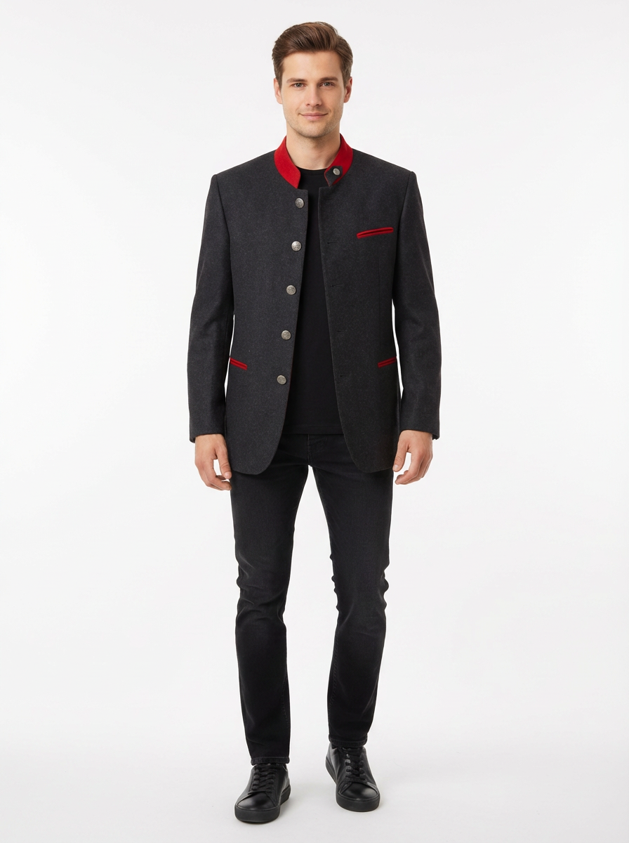 Das Sakko Bergisel aus feinstem STRETCH-Loden überzeugt durch höchsten Tragekomfort und perfekte Passform. Das innovative Material passt sich dem Körper an und fühlt sich angenehm leicht an. Typische Tiroler Knöpfe und der markante rote Kragen mit Tiroler Knopf verleihen dem Sakko seine edle, traditionelle Note.