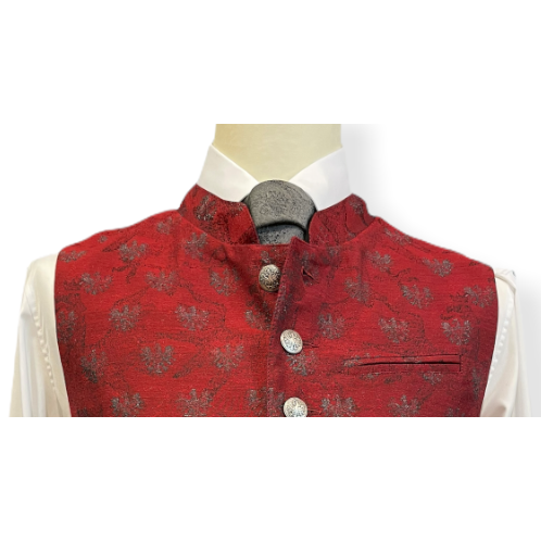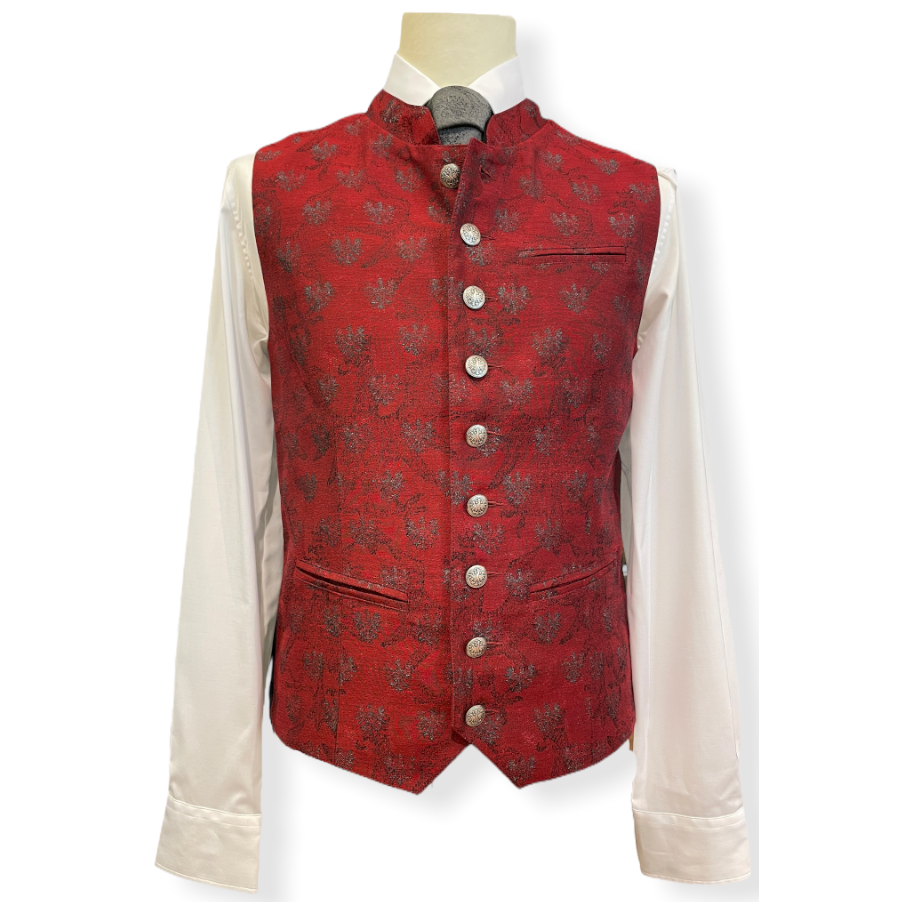 Unsere neueste Tiroler Weste Jakob aus der Hedwig Rauscher (Heu&Stroh) Kollektion in rot aus einem schönen Stoff mit eingewebten Adlern.