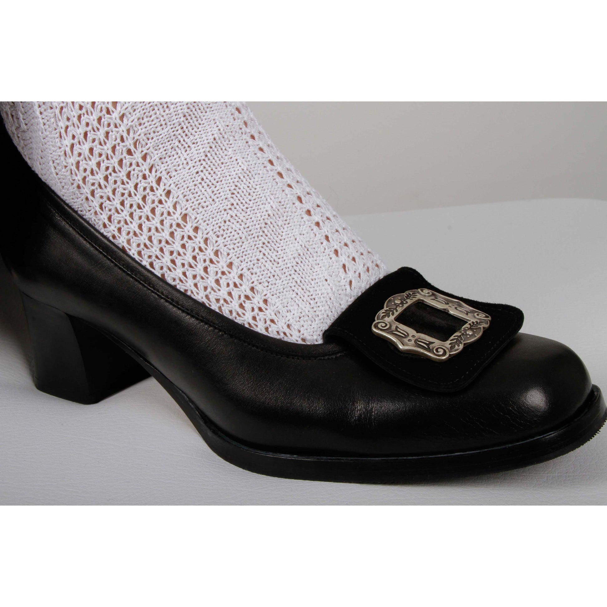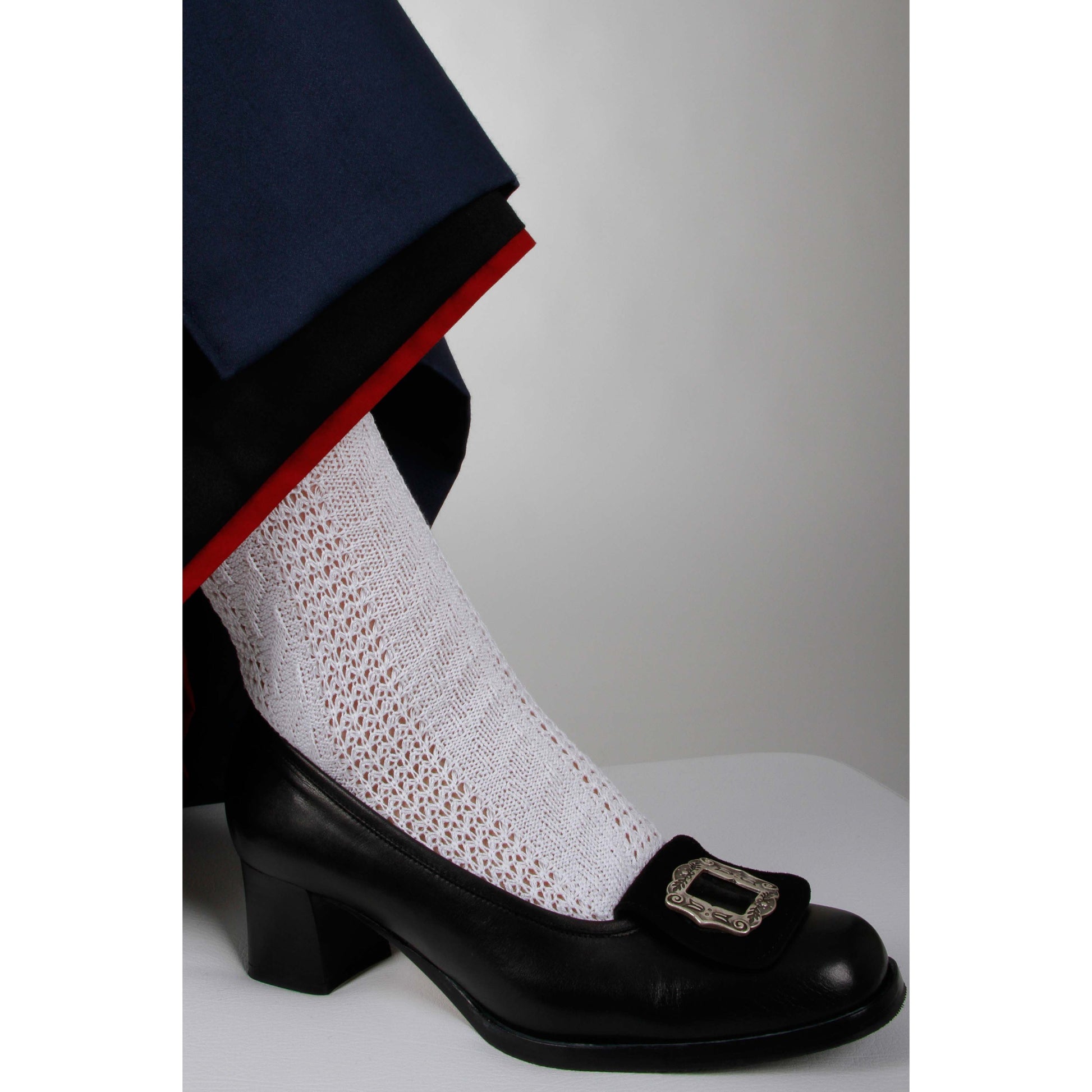 Weißer Trachtenstutzen mit Lochmuster, an Zehenspitzen per Hand verkettelt, Ferse verstärkt.