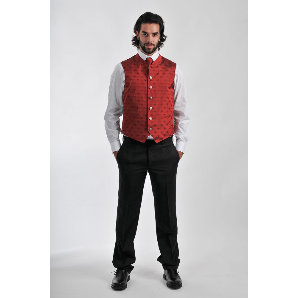 Schöne rote Weste aus Halbseide mit Tiroler Adler und silbernen Tiroler Adler Knöpfen. Perfekt passend zu unserem Tiroler Anzug und Sakko Programm!